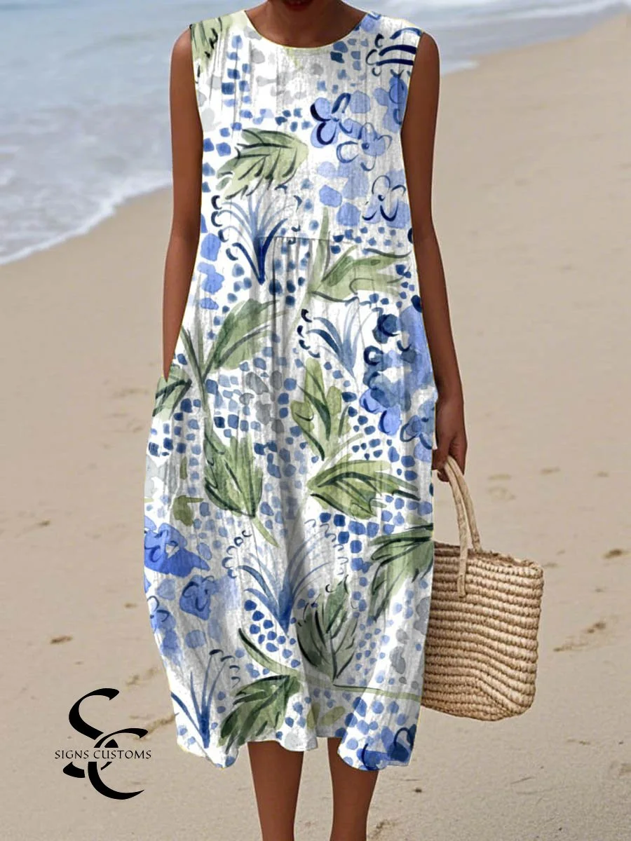 Women's Vintage Floral Pattern Art Print Sleeveless Cotton Pocket Wrap Dress