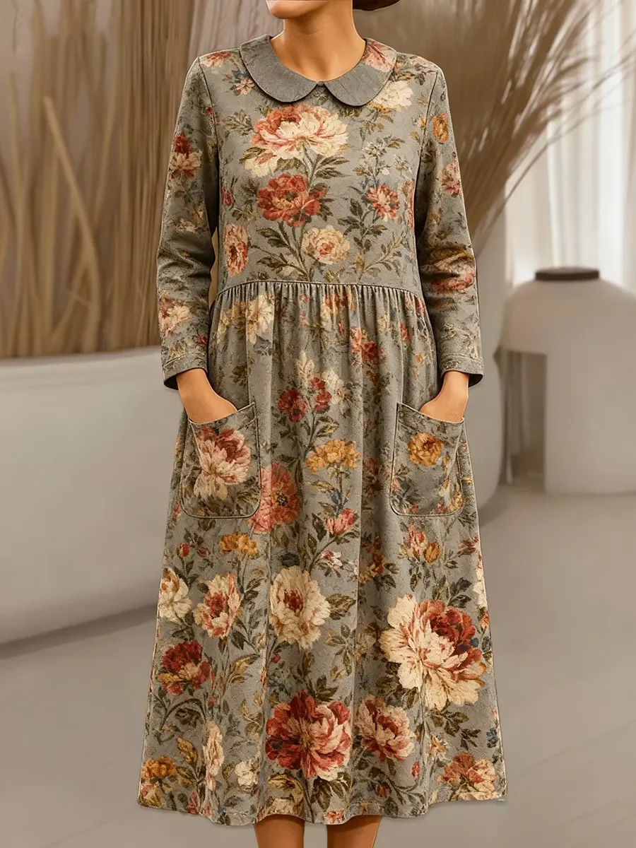 Women's Vintage Flower Pattern Art Print Cotton Lapel Shirt Dress