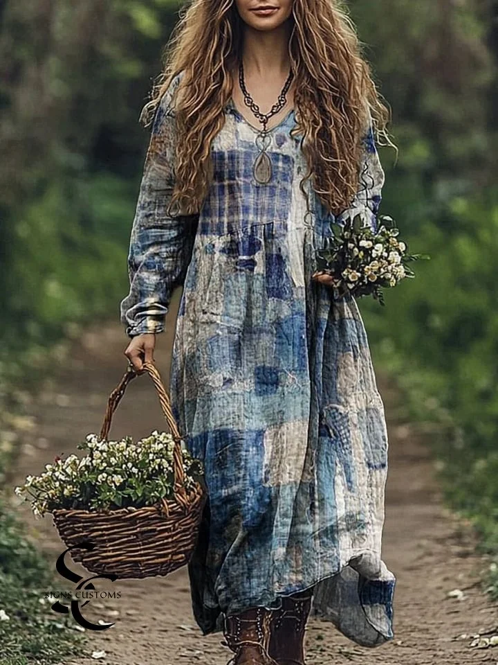 Women's Vintage Imitation Patchwork Print Cotton Pocket Dress