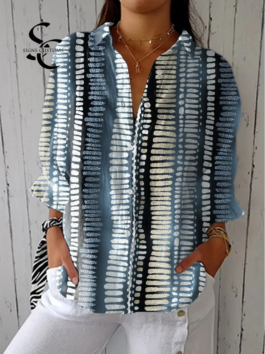 Women's Vintage Line Art Print Casual Linen V-neck Shirt