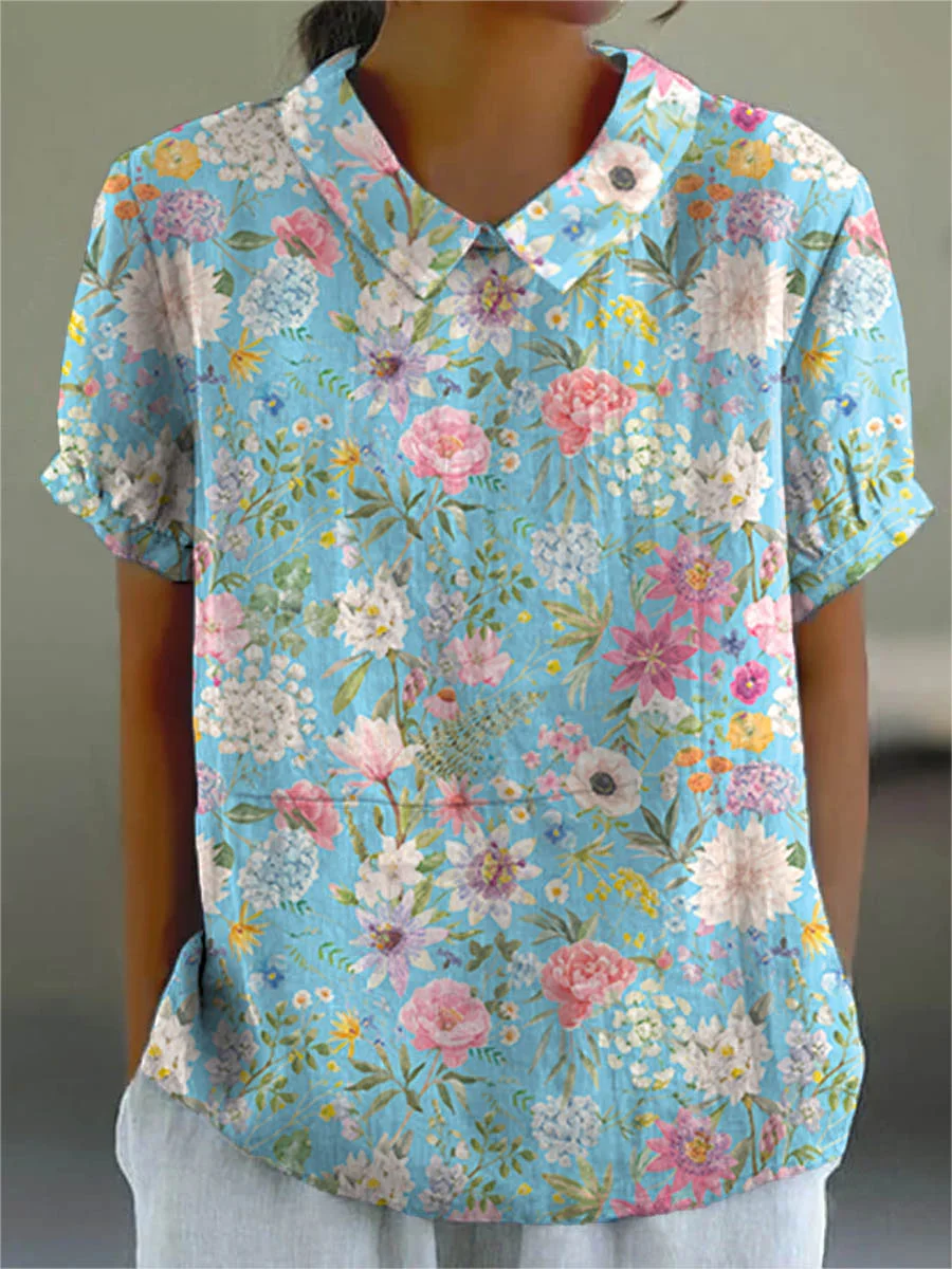 Women's Vintage Lovely Floral Art Print Casual Cotton And Linen Shirt