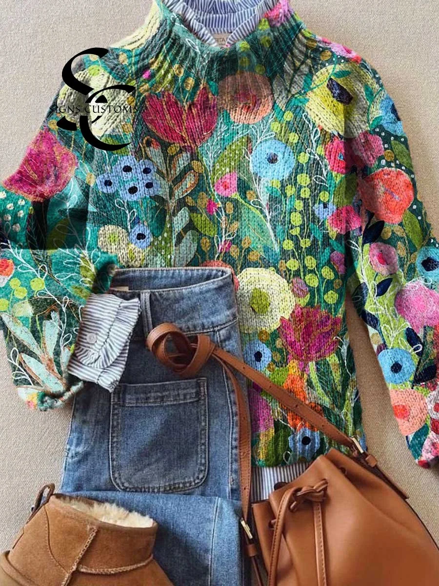 Women's Vintage Lovely Floral Art Print Knit Turtleneck Pullover Sweater