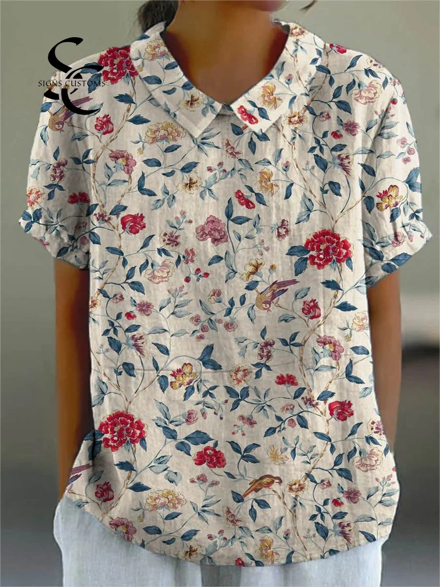 Women's Vintage Lovely Floral Pattern Art Print Casual Cotton And Linen Shirt